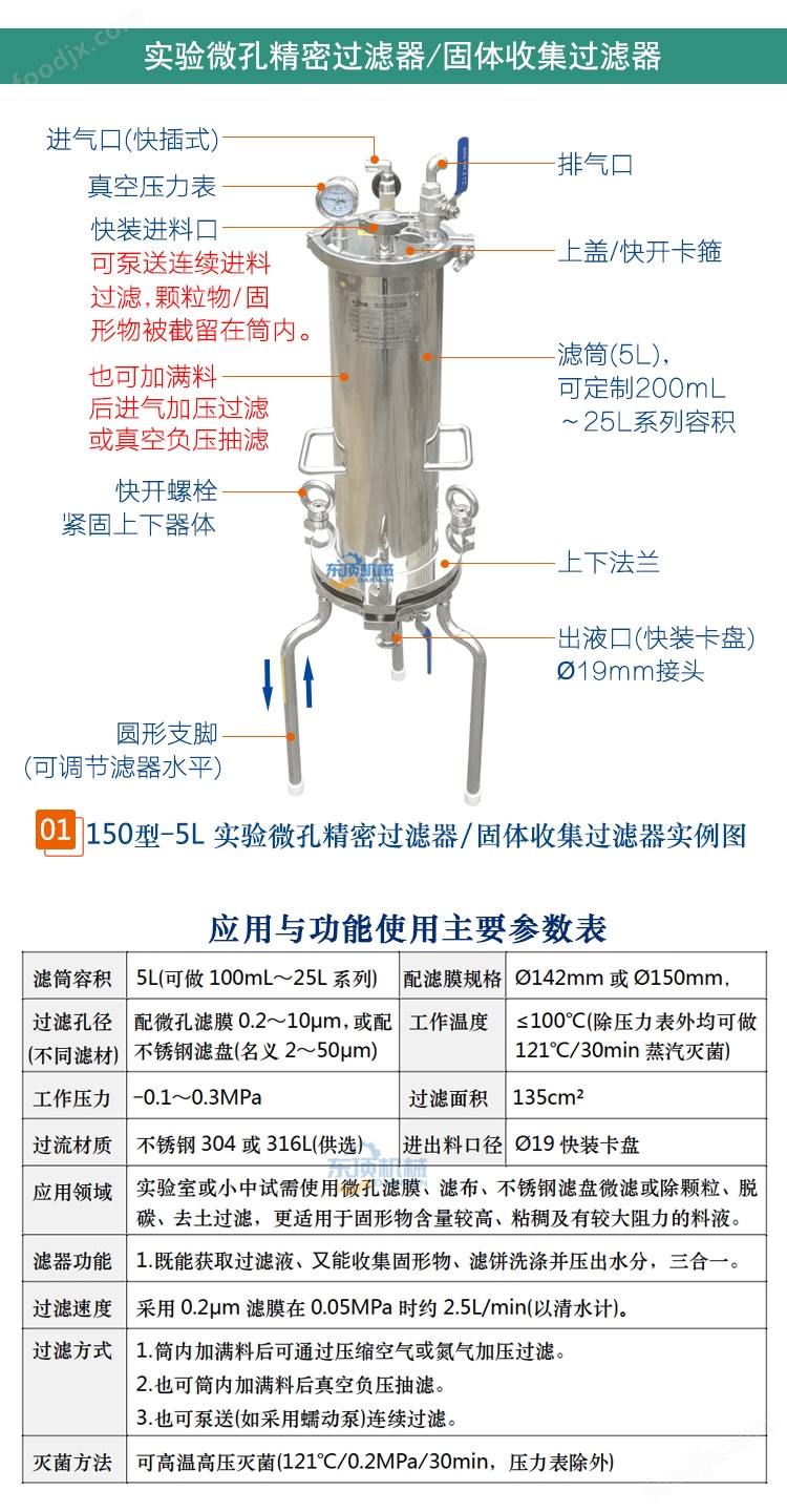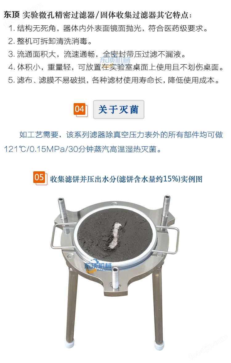 東頂——固液分離精密過濾器又名固體收集過濾器、真空負壓抽濾器、微孔濾膜正壓過濾器,由單層或雙層圓盤平板+濾筒組成,適用于生物制品、醫藥、新能源、食品飲料等行業的少量料液進行除顆粒或澄清過濾、微濾除菌、收集固形物并壓出水分及科研小、中試使用的實驗室過濾器。