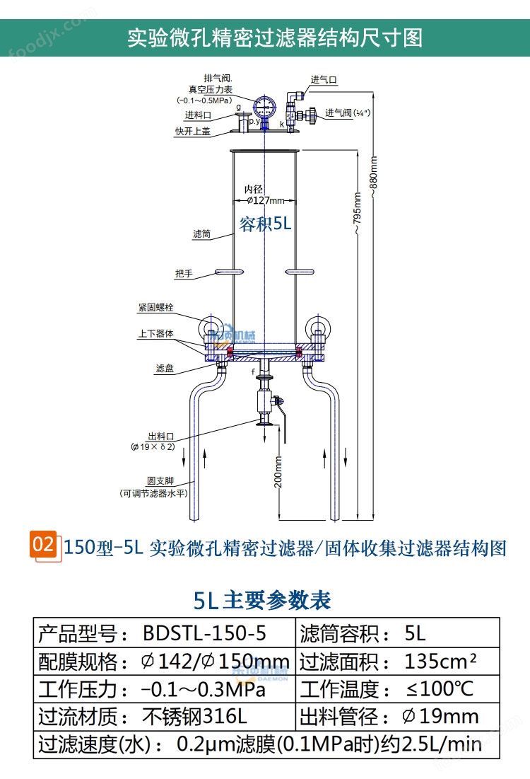 過濾孔徑:0.22μm(微米)~10目(過濾精度取決于使用濾材的精度)